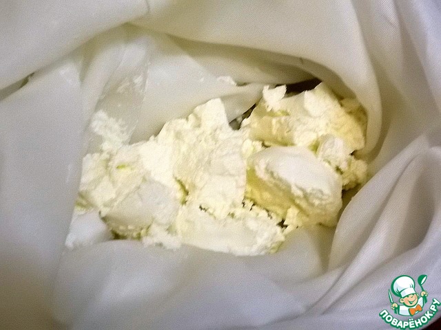 Перекладываем массу в ткань и фильтруем до полного оттока сыворотки. Вот такой он получился.