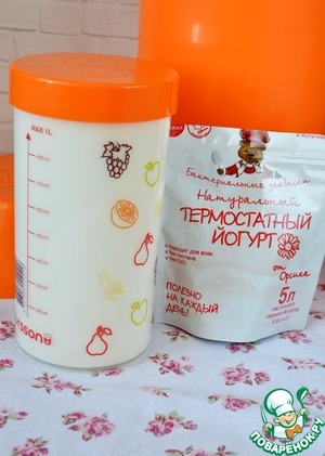 - в 1 литре молока комнатной температуры растворить содержимое 1 стика закваски "Термостатный йогурт" от Орсика, хорошо перемешать ложкой