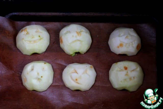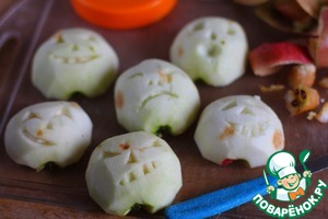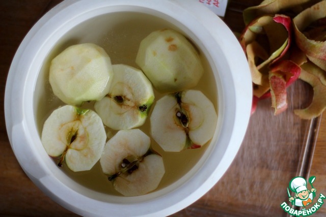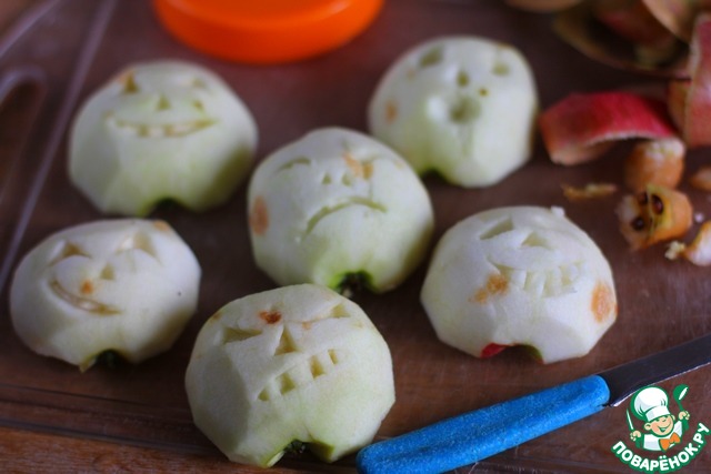 Сначала почистим яблоки, разрежем их пополам и отправим в солёную воду (1 ч. л. на литр воды) на 10-15 минут. Это нужно для того, чтобы после прорезания рожица осталась светлой, а впадины потемнели.