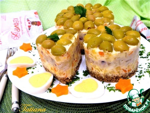 Подавайте салат на десертной тарелке (предварительно вынув из формы), украсить можно вареными овощами и яйцом.