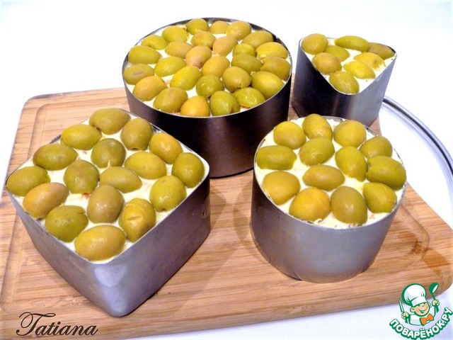 Оливки разрежьте на половинки, выложите по всей поверхности формочки.
