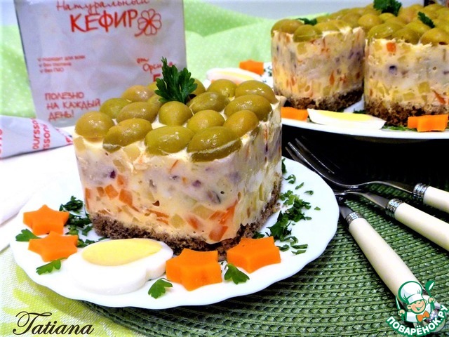 Простой и незатейливый салат из доступных продуктов может стать украшением любого праздничного стола, если подать его порционно на хлебных тостах, да еще изменив привычную майонезную заправку на пикантный соус из кефира. Густой кефир от Орсика-прекрасно подходит для салатной заправки!!!