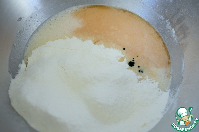 • Добавить коньяк, просеянную муку и пищевой краситель.