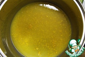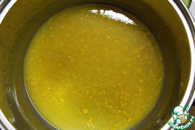 3. Цедру, свежевыжатый сок, сахар прогреть в кастрюльке до растворения сахара. Не кипятить! довести до 40С. Дать настояться минут 15, процедить через сито, чтобы отделить цедру.