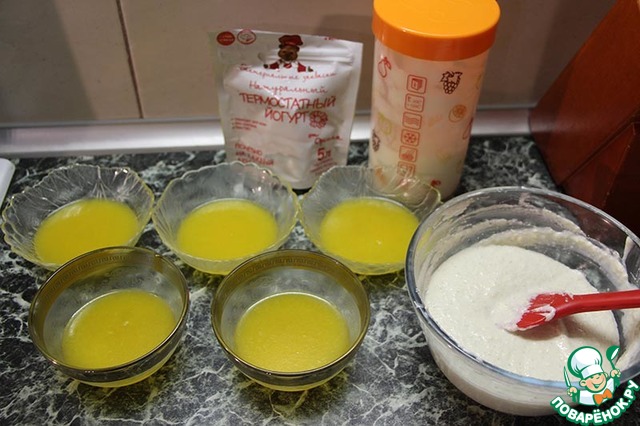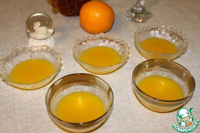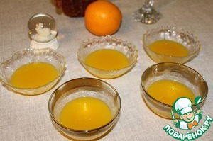 4. Набухший желатин поставить на огонь постоянно помешивая довести его до жидкого состояния. Влить в апельсиновый сок, перемешать. Разлить по креманкам и убрать в холодильник для застывания.