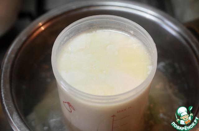 Поставьте на водяную баню и варите, пока не начнет отделяться сыворотка.