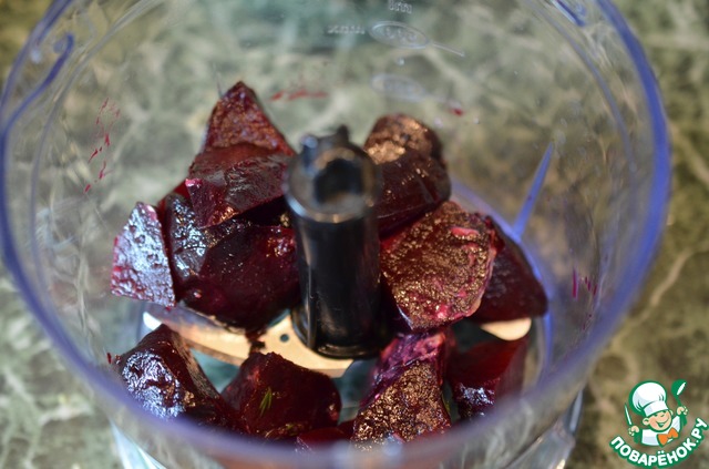 Эта закуска может быть подана, собственно, как закуска - в маленьких порционных стаканчиках. Или же как салат, - в одной большой салатницей. В любом случае, острый свекольно-творожный мусс прекрасно сочетается с чесночными сухариками.