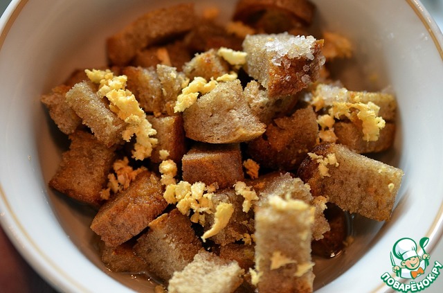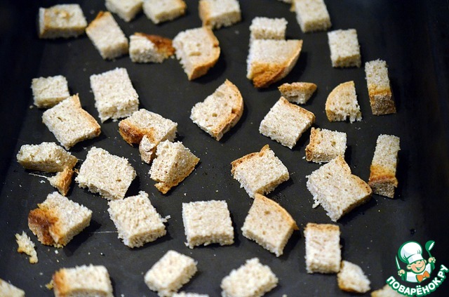 Делаем сухарики. Хлеб нарежьте кубиком. Обжарьте до хрустящего состояния на СУХОЙ! сковороде. Выложите в миску.
