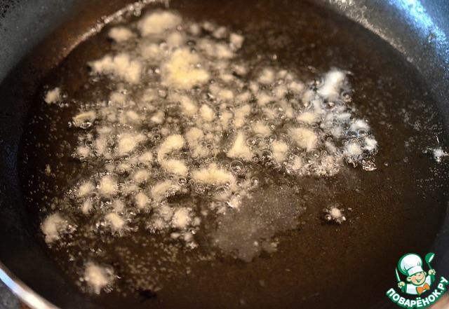 В сковороде нагрейте масло, добавьте измельченный чеснок и доведите до кипения, буквально 1 минуту. Следите, чтобы чеснок не сгорел!.