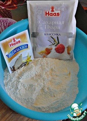 Смешать ванилин с сахарной пудрой. Готовое печенье посыпать ванильной сахарной пудрой, осторожно перевернуть, обсыпать другую сторону.
