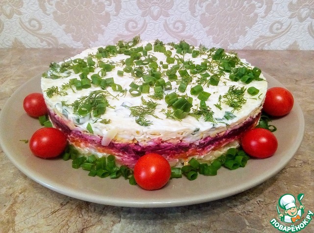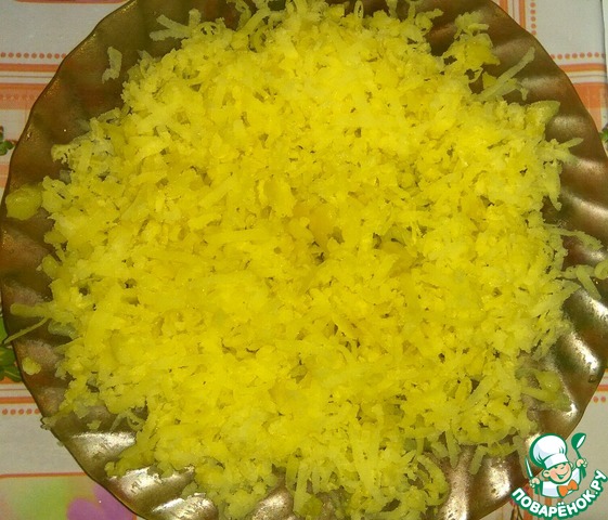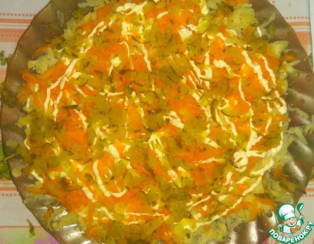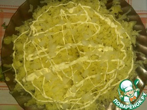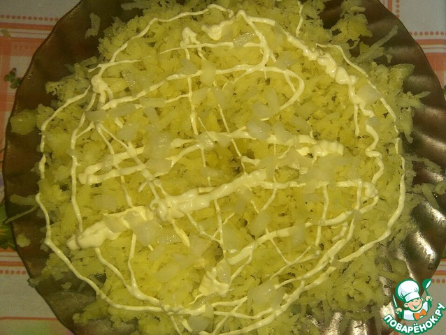 1 слой: натереть на блюдо 2 картофеля, присолить, сделать сеточку из майонеза.