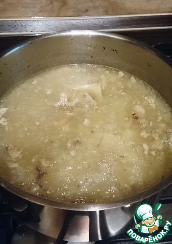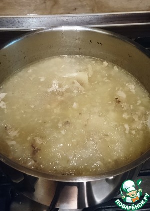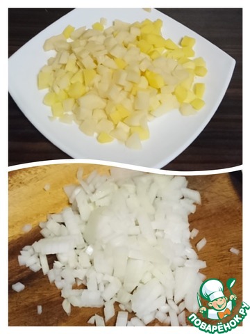 • Картофель и лук чистим, нарезаем кубиками и сбрасываем в бульон. Добавляем соль, лавровый лист и перец горошком.