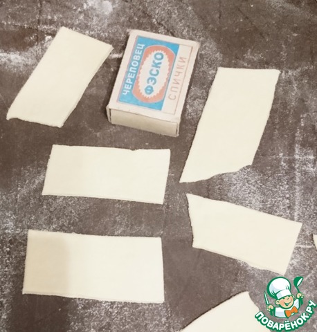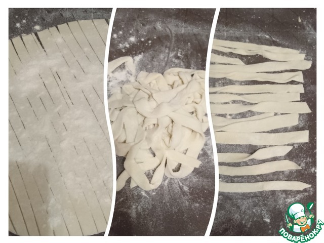• Тесто раскатать в пласт толщиной 2-3 мм. Одну половинку порезать на лепешки. Я для этого использую нож для пиццы. С его помощью получается гораздо быстрее, да и тесто остается на месте, не "тащится" за ножом.