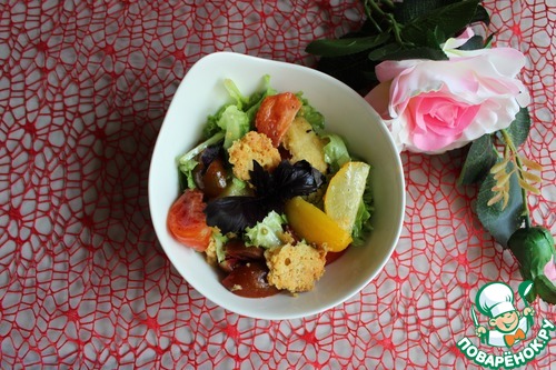 Лёгкий, оригинальный, свежий салатик. Задумывался с жареным сыром, но не та панировка. В итоге получились чипсы.