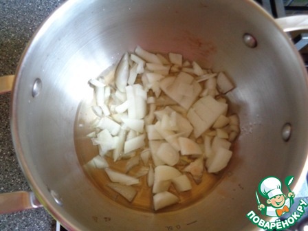 Лук мелко нарезать, поместить в кастрюлю, в которой будем варить суп, и поджарить на растительном масле до прозрачности.