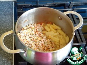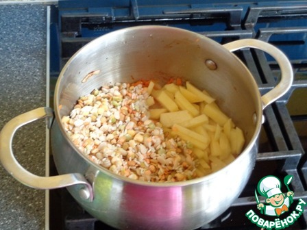 Затем добавить бобовые с крупой и нарезанный брусочками картофель.
