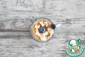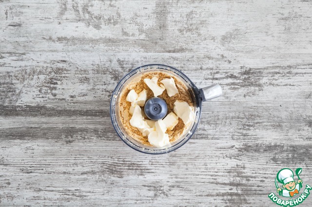 Для основы печенье поломайте и сложите в комбайн или блендер. Добавьте орехи, измельчите в муку. Положите нарезанное кусочками масло и смешайте до однородности.