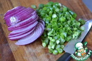 Зеленый лук мелко нарезать. Красный лук нарезать полукольцами.