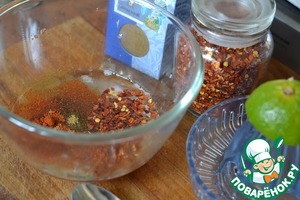 В отдельной миске смешать 3 ст. ложки подсолнечного масла, 2ст. ложки ананасового сока, лимонный сок, сладкую паприку, мелко нарезанный перец-чили, тмин, соль и черный перец.
