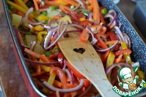 Выкладываем овощи и лук.