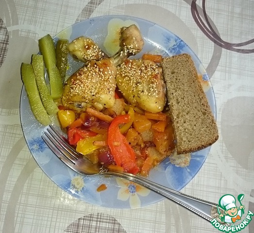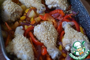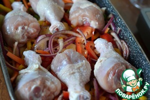 Выкладываем куриные голени на овощи.