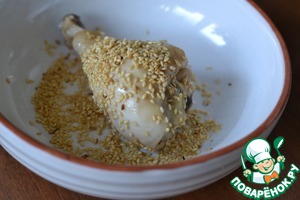 Обмакнуть каждую куриную голень в ананасовом соке и обсыпать кунжутом. -