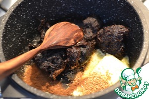 Выкладываем подготовленную свиную вырезку в форму для запекания. Добавить масло, чернослив нарезанную вторую грушу.
