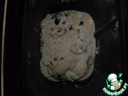 В ведро ХП кладем дрожжи, просеянную муку, соль, сахар, тыквенные семечки (предварительно пожарить), корицу, майонез, ряженку с яйцом. Ведро поместить в ХП выбрать программу "Основной хлеб с начинкой".