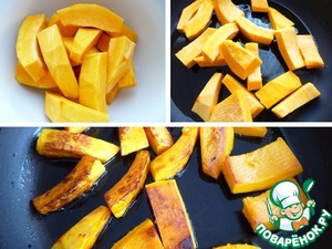 Выложить в нее тыкву, немного посолить, поперчить, добавить специи. -