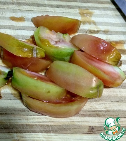 Помидоры порезать дольками - я режу пополам, потом каждую половинку на 4-6 ломтиков, в зависимости от размера плода.