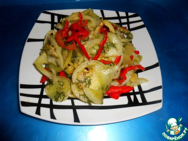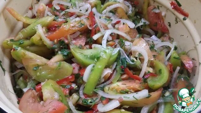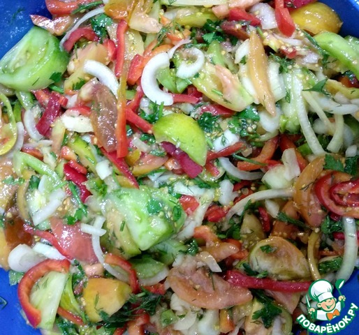 Салат готовится на осень, в ведре или кастрюле. Стоит в холодном месте 1-2 месяца. Пикантный, вкусный и не трудоемкий в процессе приготовления. В нашей семье этот салат готовится уже много лет.