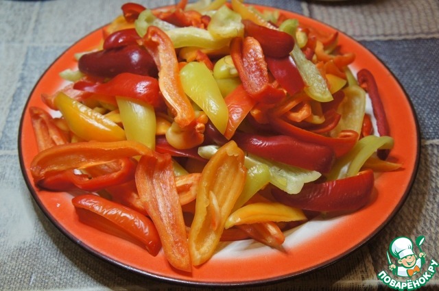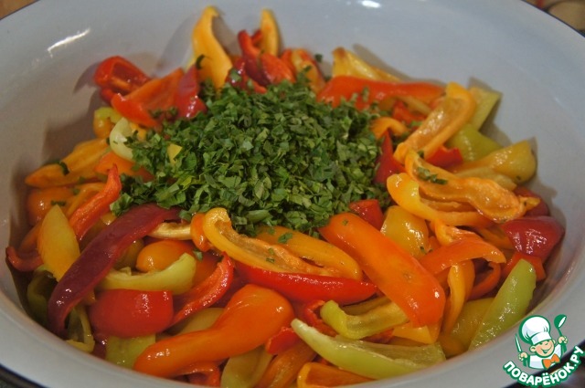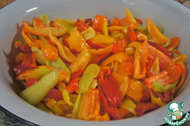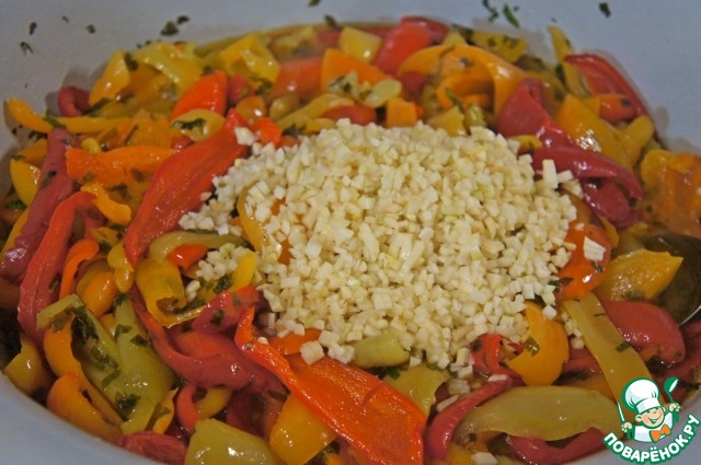По истечении 15 минут добавить к перцу чеснок и уксус и варить еще 10 минут, помешивая. Кипящим разложить в простерилизованные горячие банки, закатать, перевернуть на крышку и укутать до полного остывания.