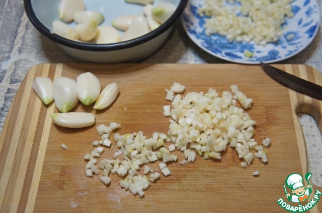 Тем временем чеснок измельчить ножом не слишком мелко.