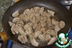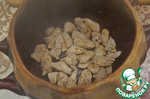 Мясо посолить, поперчить и обжарить в глубоком сотейнике на растительном масле до легкой румяной корочки.