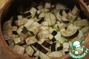 Мясо нарезать кусочками, картофель небольшими, а морковь маленькими кубиками, кабачок и баклажан брусочками или крупными кубиками, капусту разобрать на соцветия, порей нарезать полуколечками.