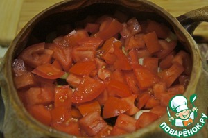 На самый верх высыпать помидоры, нарезанные кубиками или ломтиками.