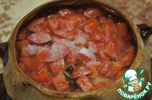 Залить горячей водой так, чтобы содержимое горшка было покрыто на пару см (впрочем, это зависит от густоты, какую вы хотите получить), посолить.