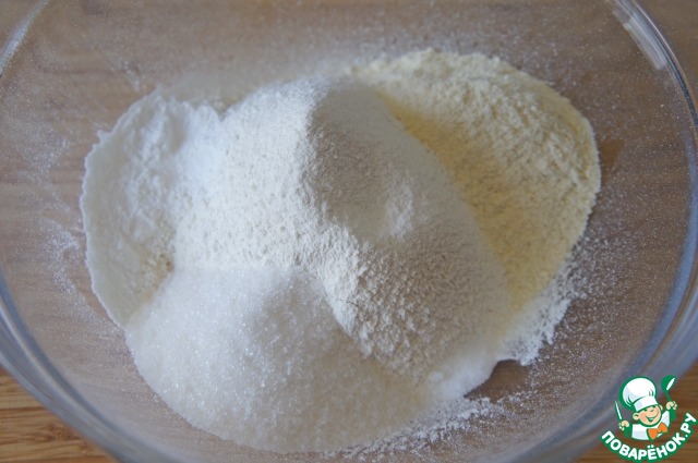 Смешать оба вида муки с 3-мя ст. л. сахара и разрыхлителем.