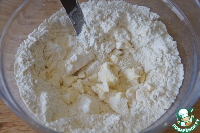 Добавить холодное масло и растереть его с мукой в мелкую крошку.