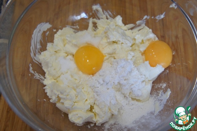 В творог добавить ванилин, крахмал, желтки и хорошо вымешать.