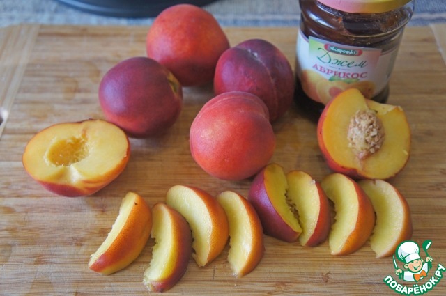 Персики тщательно вымыть, чтобы смыть с кожицы пушок, обсушить салфеткой. Удалить косточки. Мякоть нарезать дольками.