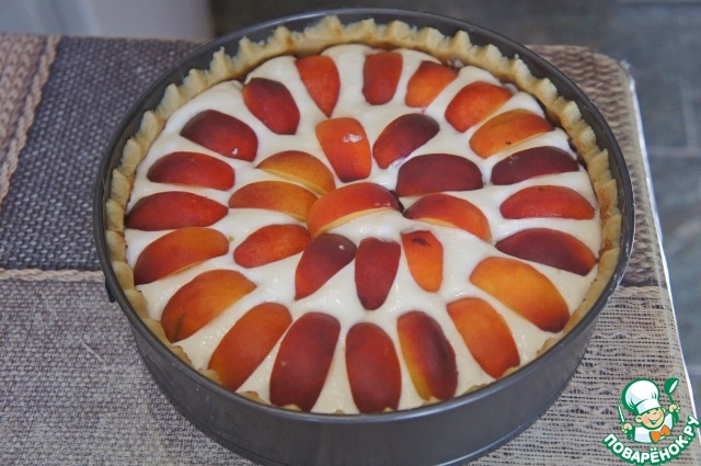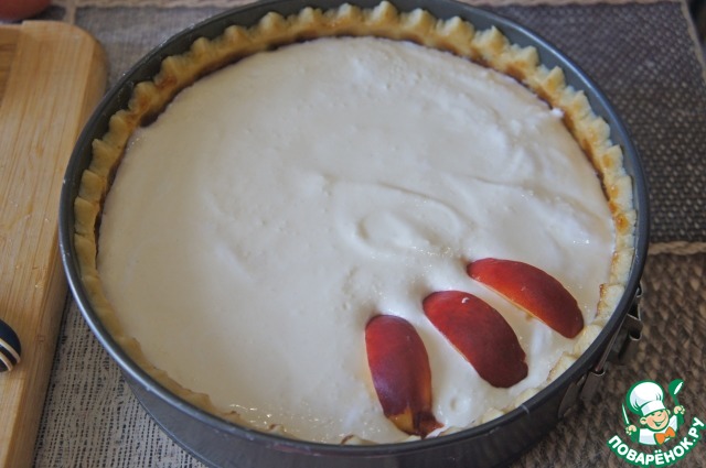 Сверху уложить дольки персиков. Слегка вдавить их в в творожную массу. Только слегка.
