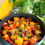 Тушеная тыква - рецепт особенно популярный осенью. Хочу предложить приготовить тыкву с консервированной фасолью. Это очень сытное и в то же время довольно легкое блюдо. Продукты простые и доступные, а результат великолепный. Яркое, насыщенное, уютное блюдо. Можно использовать в качестве гарнира к мясным блюдам и как самостоятельное блюдо.