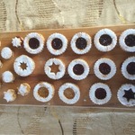 Теперь вырежьте печенье с помощью формочек. Печенье может быть любого размера и формы. Нужно вырезать одинаковое количество целого печенья и печенья с отверстием по серединке.