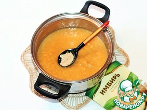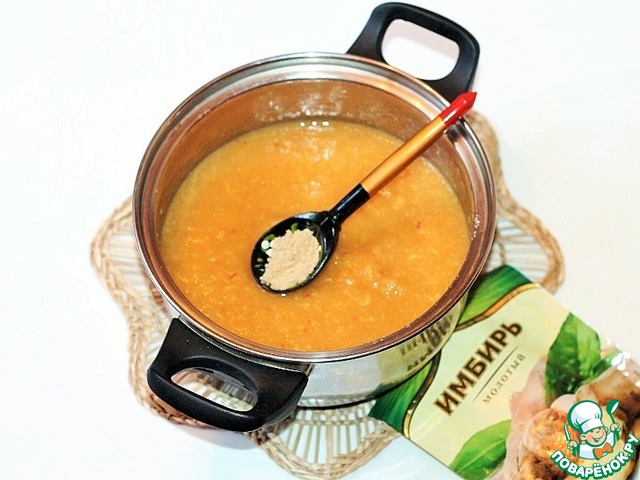 • 6. Затем добавить имбирь и фруктовое пюре. Заправить соус небольшим количеством малиновым или вишневым ликером, или ромом, или коньяком. Я выбрала 2 ст. л. коньяка и добавила 2 ч. л. малинового джема, протертого через сито.