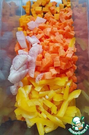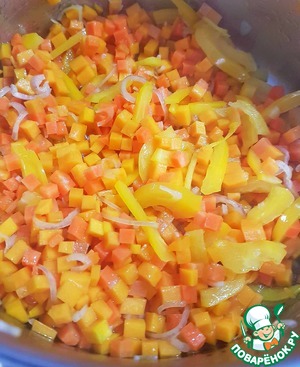 Морковь и тыкву нарезать мелкими кубиками, перец и лук тонкими перьями.