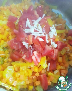Помидор нарезать удобным для вас способом (предварительно можно снять шкурку с помидора), чеснок мелко нарубить. Добавить к овощам, перемешать и жарить пару минут.
