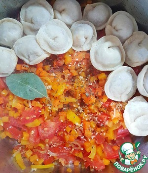 Посолить, добавить щепотку мускатного ореха, и любые ваши любимые специи + лавровый лист. Выложить одним слоем пельмени (у меня замороженные). Залить кипятком на 2-3 см выше пельменей, после закипания убавить огонь и варить под закрытой крышкой до готовности пельменей.