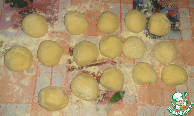 Тесто делим на 8 равных кусочков, потом каждый кусочек ещё на 2. Должно получиться 16 примерно одинаковых кусочков теста.