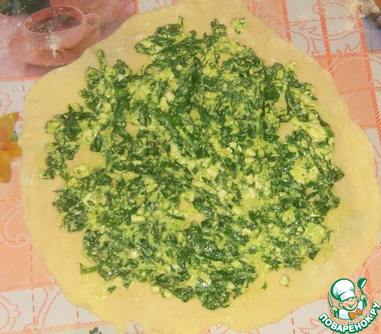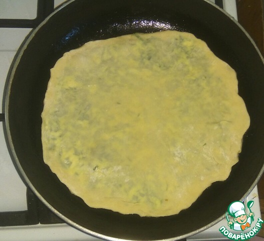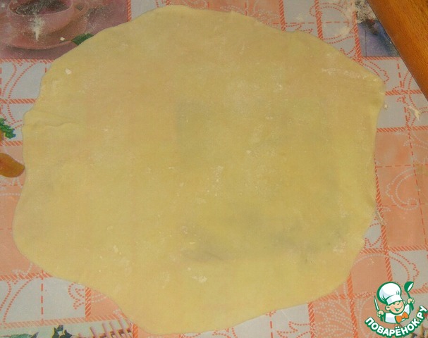 Накрываем вторым тонко раскатанным кусочком теста. Края хорошо слепляем. Посыпаем скалку мукой, и раскатываем аккуратно лепешку.